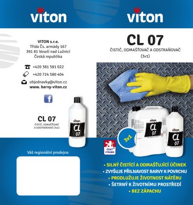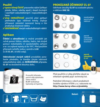 Čištění a odmašťení je možné provádět jak ručně, tak strojně pomocí nízkotlakého či vysokotlakého zařízení a to i za zvýšené teploty až do 70°C. Před použitím přípravek nařeďte vodou v poměru 1:10 (1 díl CL 07, 10 dílů vody).