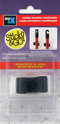 Držák - svorka z kalené oceli s protiskluzovou výztuhou pro zavěšení úklidového nářadí s rukojetí o průměru 20-26 mm.