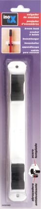 Dvě kalené ocelové svorky s protiskluzovou výztuhou na ocelové základně. Vhodné pro zavěšení úklidového nářadí s rukojetí o Ø 20-26 mm.