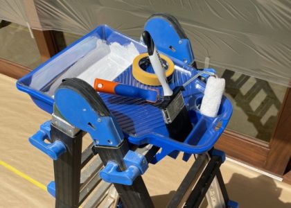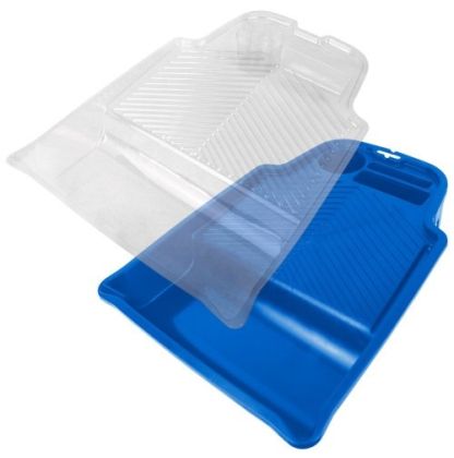 Plastová vanička s otvory pro odložení válečku a štětců. Díky kotvám lze vaničku také připevnit k žebříku.