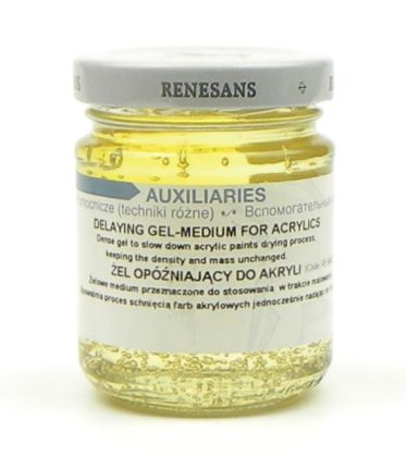 Zpomalovací gel pro akrylové barvy od značky Renesans v balení 110 ml. Gel smíchejte v malém měřítku s barvou a promíchejte, odstín ani hustota barvy se tím nezmění. Gel prodlouží dobu schnutí akrylových barev až na několikanásobně delší dobu, vhodné na zanechání možnosti pro dodatečné úpravy v malbě či na velké formáty.