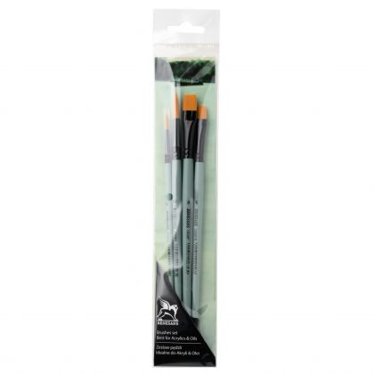 Sada velice oblíbené řady štětců Renesans 1006, která kombinuje kvalitu, dlouhou výdrž a nízkou cenu. Syntetické štětiny jsou středně tuhé, mohou se univerzálně používat pro akrylové, olejové, temperové, kvašové i akvarelové barvy.