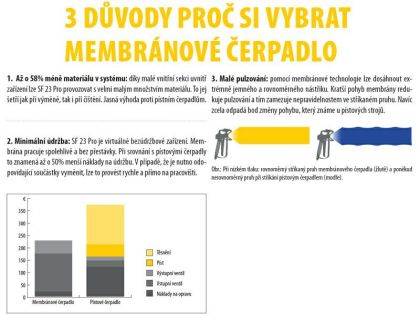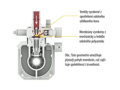 - patentovaná QLS membránová technologie s velkým zdvihem - znamená, že zařízení bez problémů čerpá i husté materiály - disperze apod.